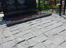 Далее мы привозим гранит для подставки под памятник, балки цветника и брусчатку. Для того, чтобы брусчатка не разваливалась в последствии по бокам, мы обвариваем периметр под оградой металлической полосой. После установки гранита и брусчатки могила выглядит следующим образом.